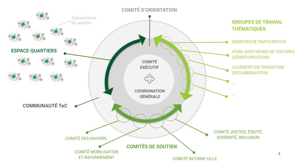Nous sommes organisés autour d’instances, comités et groupes de travail thématiques qui ont les caractéristiques communes de rassembler une représentation diversifiée (institutions, organismes de la société civile, groupes quartiers et citoyens, chercheurs) et d’investir le défi de la co construction.