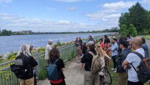 After taking the bus to the borough’s waterfront, we went to meet the Comité de la promenade du Sault d’Ahuntsic, which is fighting for universal public access to the Rivière des prairies. An explanatory video was produced about the committee: https://www.youtube.com/watch?v=Isu385ztwe0&t=1s. https://www.facebook.com/groups/498198107826494/user/100080316020866/